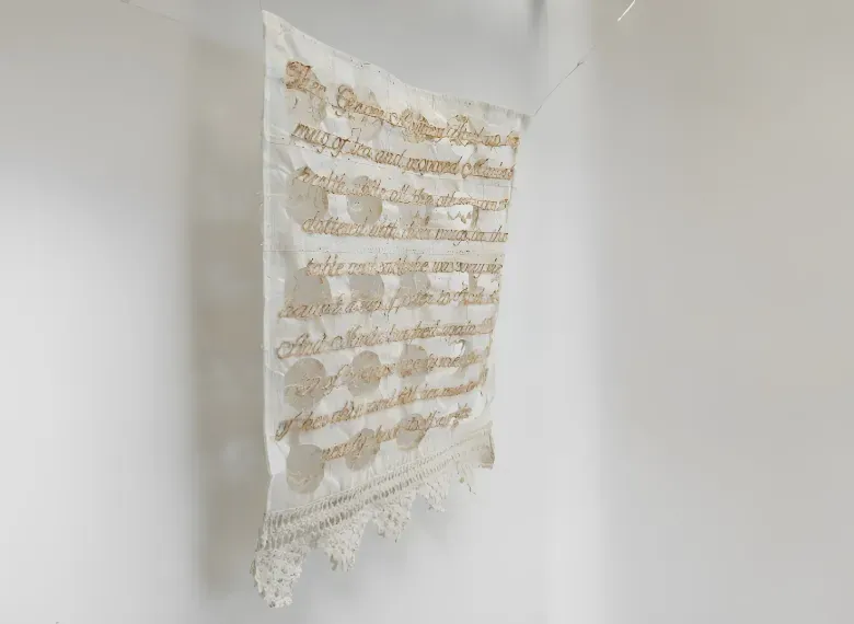 The cover image features artwork by Lilian Mackey one of the curators of the exhibition. Mackey is a Northern Irish artist whose work is grounded in the quiet power of ritual, language, and material memory. Her use of stitched idioms and cultural phrases reflects how language is passed between generations, held, repeated, and reinterpreted over time.